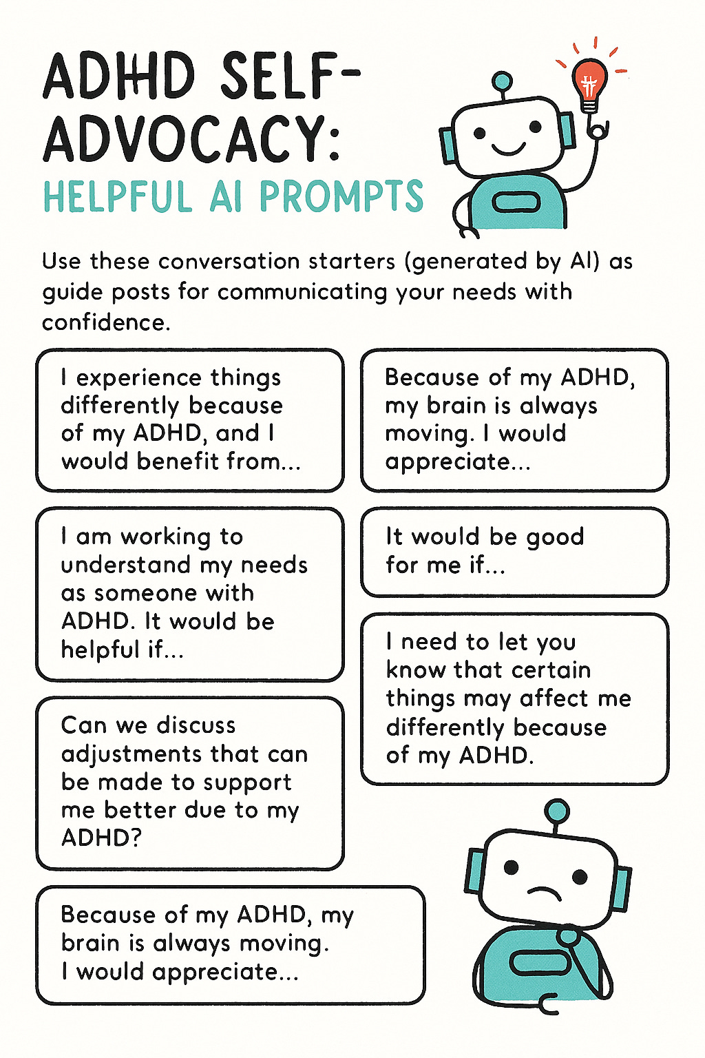 When thoughtfully used, AI tools help organize thoughts, highlight priorities, and practice self-expression, making self-advocacy more manageable and effective. And while not a replacement for in-person support, AI can guide us in answering questions like these and empower us to communicate more confidently and clearly without the fear of being judged or misunderstood.